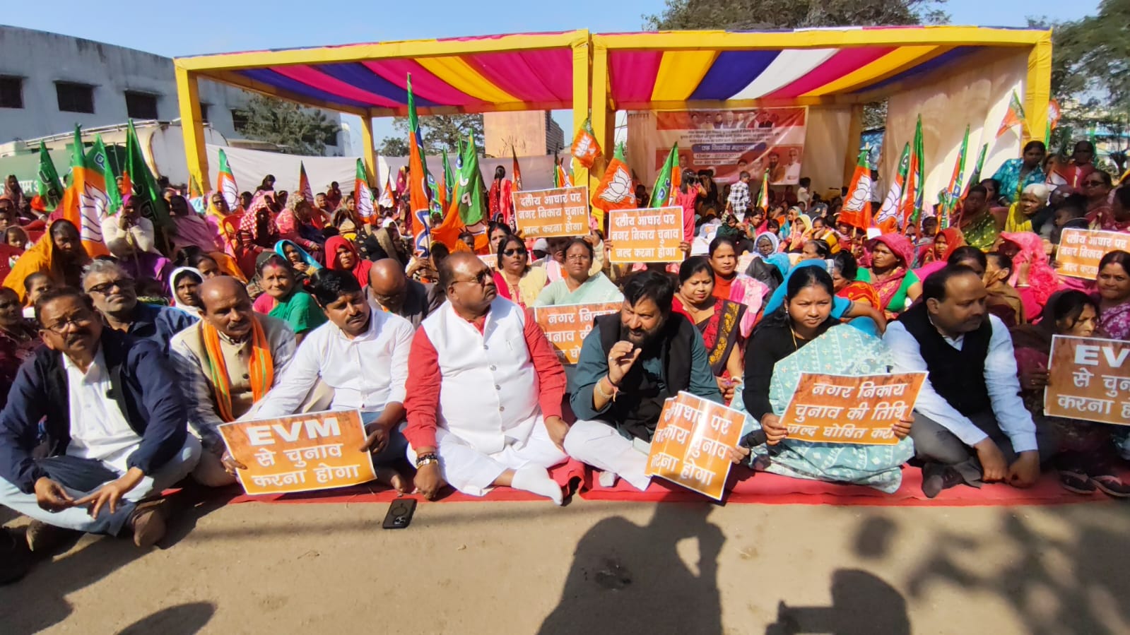Adityapur News: झारखंड में लंबे समय से लंबित नगर निकाय चुनावों को लेकर सियासी पारा चढ़ गया है। बुधवार को भारतीय जनता पार्टी भाजपा सरायकेला जिला इकाई की ओर से आदित्यपुर नगर निगम कार्यालय के समक्ष एक दिवसीय विशाल धरना-प्रदर्शन किया गया। इस प्रदर्शन के जरिए भाजपा ने हेमंत सरकार के खिलाफ मोर्चा खोलते हुए चुनाव की तिथि जल्द घोषित करने और इसे दलीय आधार पर EVM के माध्यम से कराने की मांग की।