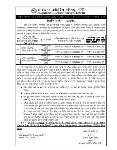 Jharkhand Academic Council: 18 नवंबर से शुरू होगा मैट्रिक व इंटर परीक्षा फॉर्म भरने का काम, जैक ने जारी किए दिशा-निर्देश