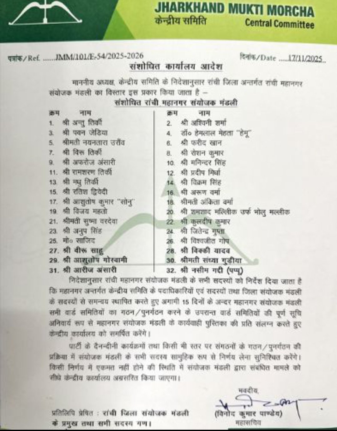 संशोधित रांची महानगर संयोजक मंडली में शामिल किए गए प्रमुख सदस्यों में अश्विनी शर्मा, पवन जेडिया, डॉ. हेमलाल मेहता “हेमू”, नयनतारा उरॉव, फरीद खान, विरू तिर्की, रोशन कुमार, अफरोज अंसारी, मनिन्दर सिंह, रामशरण तिर्की, प्रदीप मिर्धा, मधु तिर्की, विक्रम सिंह, रतिश द्विवेदी, अरुण वर्मा, आशुतोष कुमार “सोनु”, अंकिता वर्मा, विजय महतो, शमशाद मल्लीक, सुष्मा वरदेवा, कुलदीप कुमार, अनुप सिंह, जितेन्द्र गुप्ता, मो. साजिद, विश्वजीत गोप, वीरू साहु, विक्की यादव, आशुतोष गोस्वामी, संध्या गुड़ीया, आरीज अंसारी, और नसीम गद्दी (पप्पू) जैसे नाम शामिल हैं।