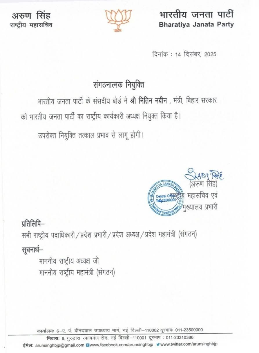 पार्टी की ओर से जारी आधिकारिक सूचना के अनुसार नितिन नबीन को भारतीय जनता पार्टी का राष्ट्रीय कार्यकारी अध्यक्ष नियुक्त किया गया है. यह नियुक्ति तत्काल प्रभाव से लागू मानी जाएगी और इसके साथ ही वे संगठन में अपनी नई भूमिका निभाना शुरू करेंगे. यह जानकारी भाजपा के राष्ट्रीय महासचिव अरुण सिंह की ओर से जारी पत्र के माध्यम से दी गई है.