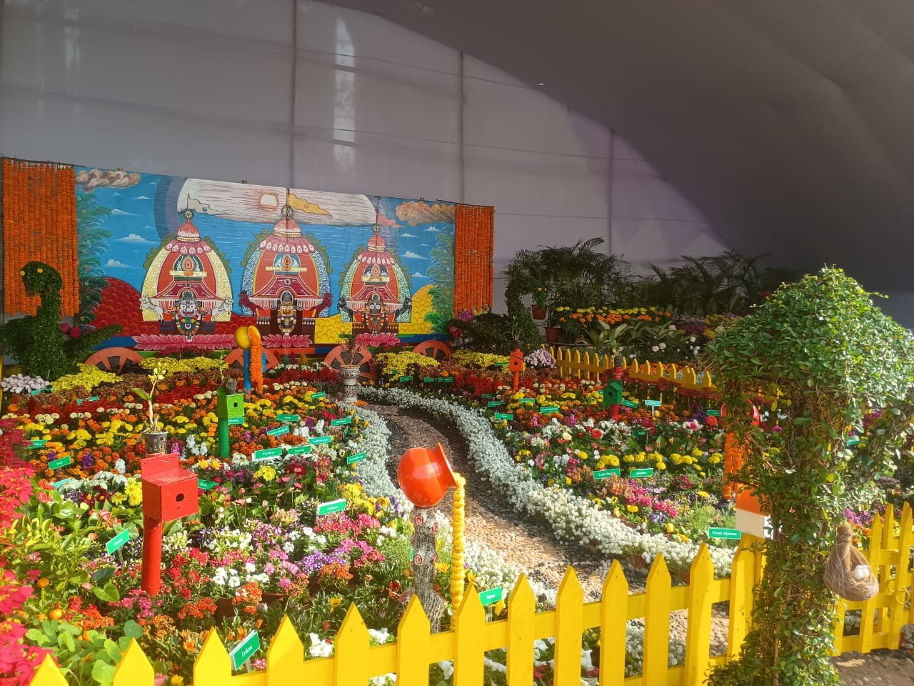 एक हिस्से में जगन्नाथ रथ की थीम पर आधारित सजावट तैयार की गई है. तीन रथों की पेंटिंग के सामने फूलों से बना गांव जैसा दृश्य दर्शकों को अपनी ओर खींचता है. सफेद फूलों से बना रास्ता, चारों ओर लगे रंग बिरंगे फूल, लाल पोस्ट बॉक्स और पीला घड़ा इस थीम को जीवंत बनाते हैं. पीली बाड़ के साथ यह हिस्सा खास तौर पर बच्चों के लिए आकर्षण का केंद्र बना हुआ है.