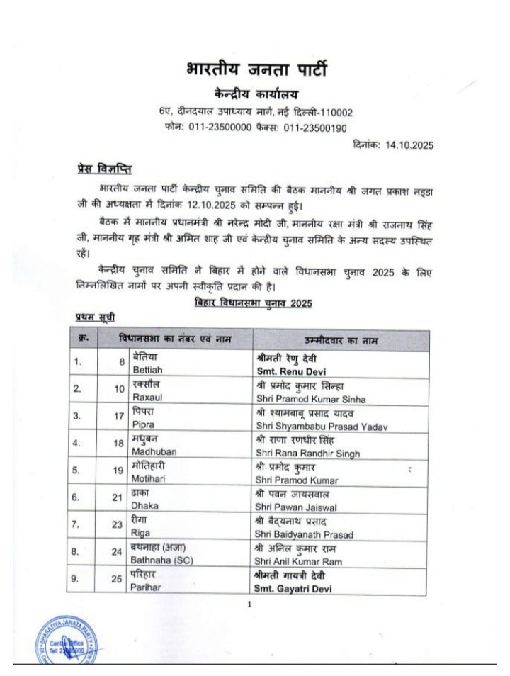 Bihar Election BJP: बिहार विधानसभा चुनाव को लेकर बीजेपी ने जारी की अपनी पहली सूची, 9 महिला उम्मीदवारों को मिला मौका, देखे पूरी सूची
