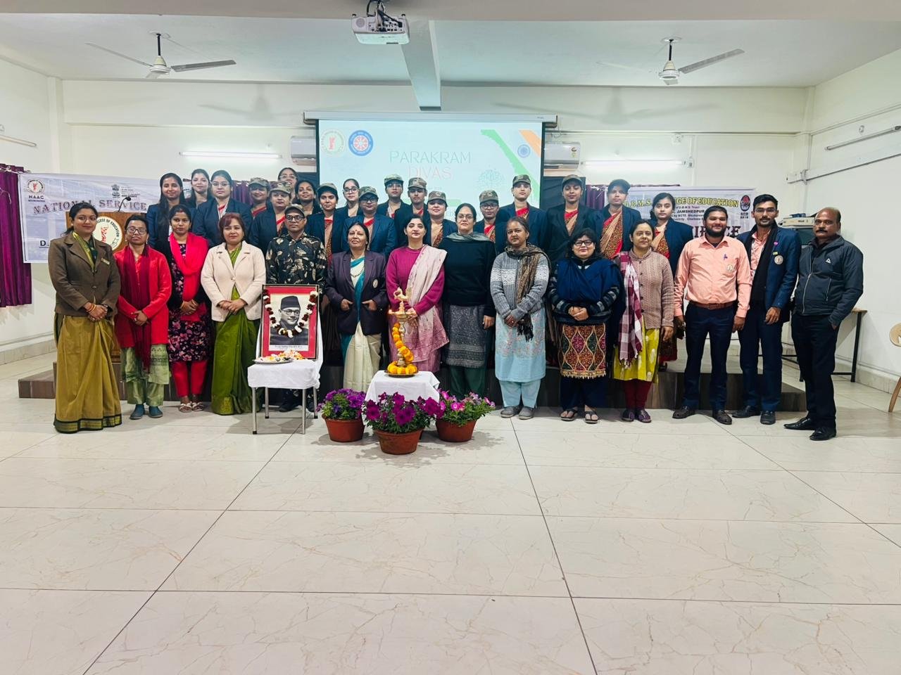 Jamshedpur: जमशेदपुर: डी.बी.एम.एस. कॉलेज ऑफ एजुकेशन में नेताजी सुभाष चंद्र बोस की जयंती के उपलक्ष्य में पराक्रम दिवस का भव्य आयोजन किया गया। एनएसएस यूनिट-1 एवं सोशल साइंस क्लब के संयुक्त तत्वावधान में आयोजित इस कार्यक्रम ने विद्यार्थियों के भीतर देशभक्ति और अनुशासन का नया जोश भर दिया।