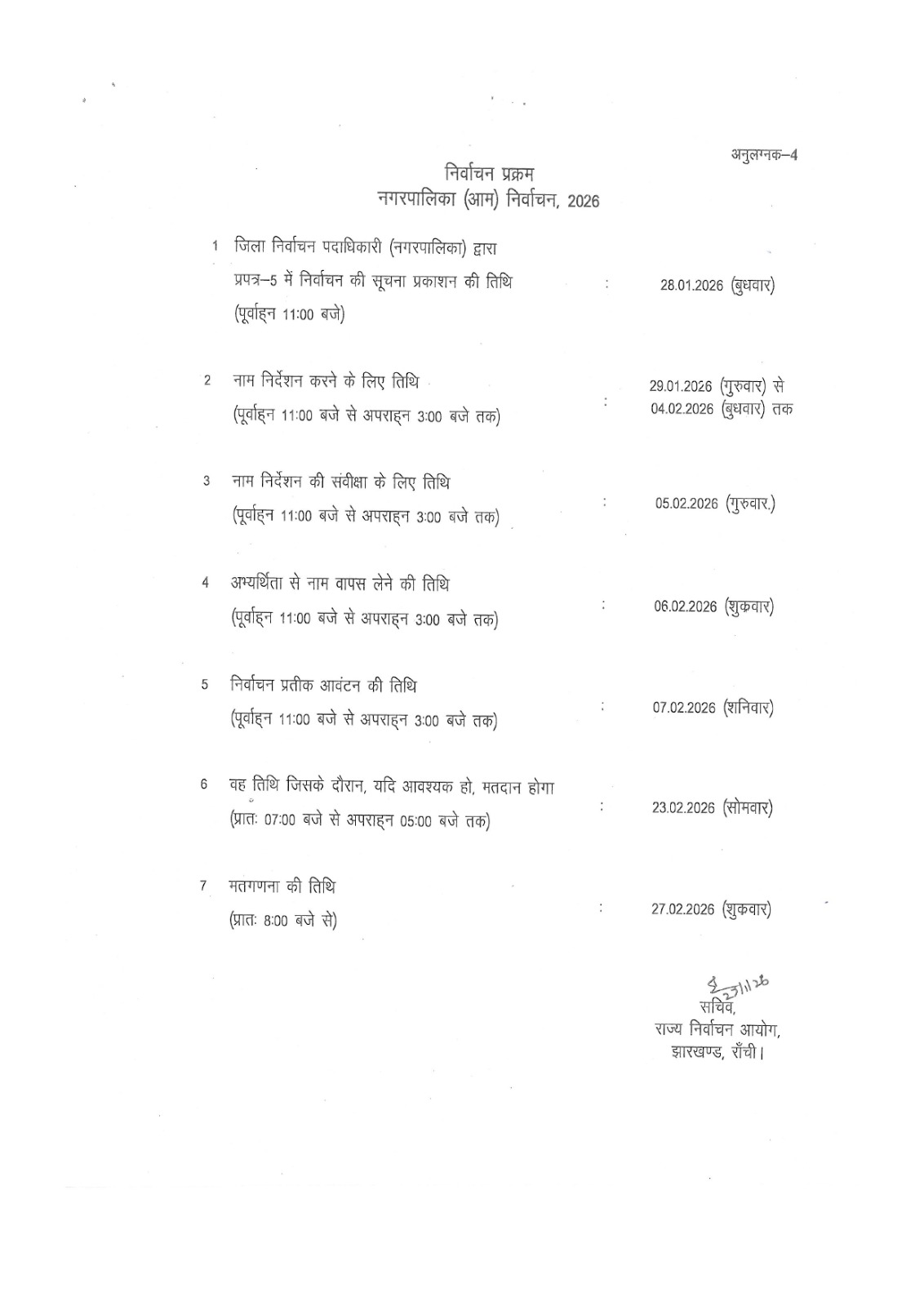BREAKING: झारखंड में नगरपालिका आम निर्वाचन-2026 को लेकर चुनावी प्रक्रिया का कार्यक्रम जारी कर दिया गया है. राज्य निर्वाचन आयोग की ओर से घोषित कार्यक्रम के अनुसार चुनाव की औपचारिक शुरुआत 28 जनवरी 2026 से होगी. इसी दिन पूर्वाह्न 11.00 बजे जिला निर्वाचन पदाधिकारी नगरपालिका द्वारा प्रपत्र 5 में निर्वाचन की सूचना का प्रकाशन किया जाएगा. इसके साथ ही चुनावी गतिविधियां तेज हो जाएंगी.