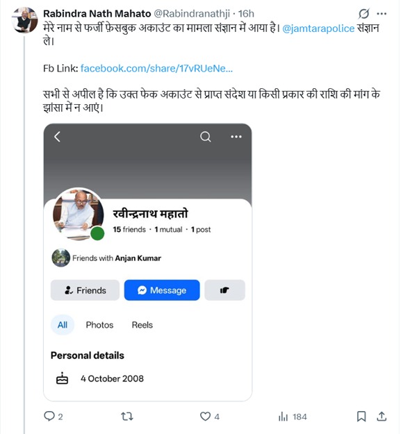 Jharkhand: झारखंड विधानसभा अध्यक्ष रवींद्रनाथ महतो के नाम से सोशल मीडिया पर एक फर्जी फेसबुक अकाउंट बनाए जाने का मामला सामने आया है, जिससे लोगों में भ्रम की स्थिति उत्पन्न हो रही है। इस संबंध में स्पष्ट किया गया है कि यह फेसबुक अकाउंट पूरी तरह से नकली है और इसका विधानसभा अध्यक्ष रवींद्रनाथ महतो से कोई भी प्रत्यक्ष या अप्रत्यक्ष संबंध नहीं है।