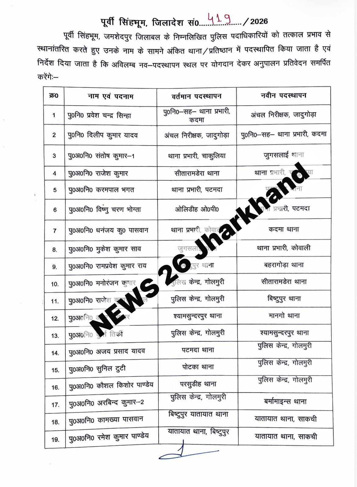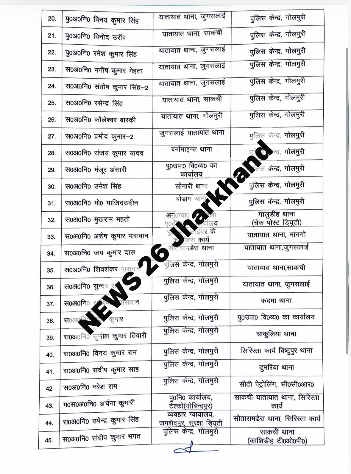 इसके अलावा दुर्गा तिर्की को श्यामसुंदरपुर थाना का जेएसआई बनाया गया है. अरविंद कुमार को गोलमुरी पुलिस लाइन से बर्मामाइंस थाना भेजा गया है. साथ ही कई एएसआई स्तर के अधिकारियों को भी अलग-अलग थानों और कार्यालयों में नई जिम्मेदारी दी गई है.