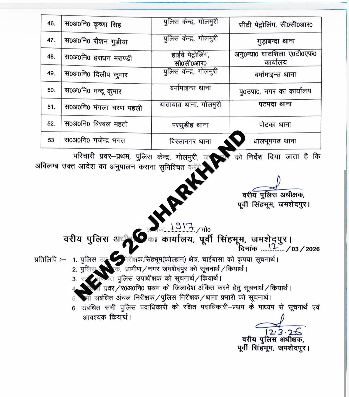 Jamshedpur Police Transfer: जमशेदपुर के वरीय पुलिस अधीक्षक (एसएसपी) पियुष पांडेय ने जिले की पुलिस व्यवस्था में बड़ा बदलाव किया है. उन्होंने एक साथ 53 पुलिस अधिकारियों का तबादला कर दिया है. इस फेरबदल के तहत कई थानों के प्रभारी बदले गए हैं, जबकि कई अधिकारियों को इधर से उधर किया गया है. यह आदेश तत्काल प्रभाव से लागू हो गया है.