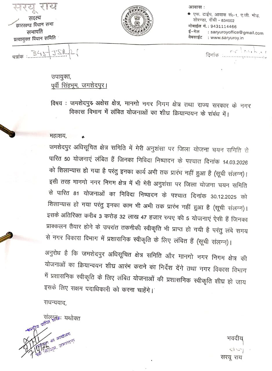 सरयू राय ने बताया कि जमशेदपुर अधिसूचित क्षेत्र समिति में उनकी अनुशंसा पर जिला योजना चयन समिति द्वारा पारित 50 योजनाओं का निविदा निष्पादन होने के बाद दिनांक 14.03.2026 को शिलान्यास कर दिया गया था, लेकिन इसके बावजूद अभी तक इनका कार्य प्रारंभ नहीं हुआ है। उन्होंने पत्र में जोर देकर कहा कि योजनाओं में देरी के कारण क्षेत्र के विकास कार्य और नागरिकों को मिलने वाली सुविधाएं प्रभावित हो रही हैं।