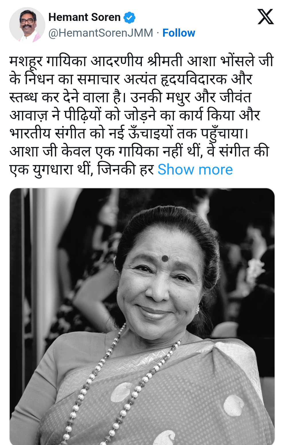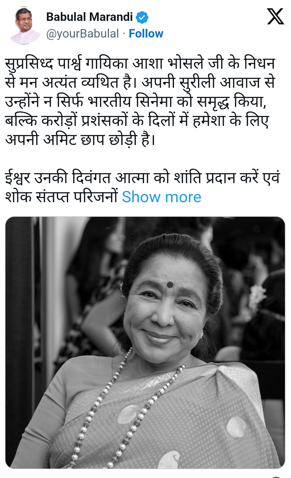 वहीं, नेता प्रतिपक्ष बाबूलाल मरांडी ने भी उनके निधन पर दुख व्यक्त करते हुए कहा कि आशा भोंसले ने अपनी सुमधुर आवाज से भारतीय सिनेमा को समृद्ध किया और करोड़ों लोगों के दिलों में अपनी अमिट छाप छोड़ी। उन्होंने दिवंगत आत्मा की शांति और परिजनों को संबल देने की कामना की।