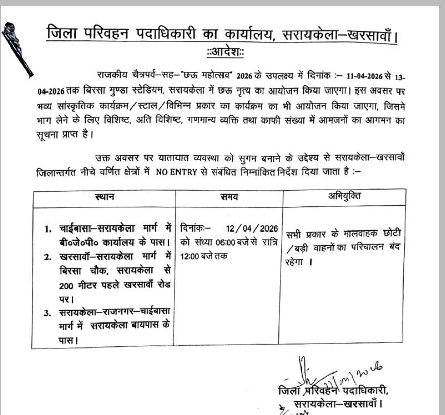 Saraikela: राजकीय चैत्र पर्व सह छऊ महोत्सव 2026 के अवसर पर सरायकेला में 11 से 13 अप्रैल तक बिरसा मुंडा स्टेडियम में भव्य सांस्कृतिक कार्यक्रमों का आयोजन किया जा रहा है। इस दौरान बड़ी संख्या में आम लोगों के साथ-साथ विशिष्ट और अतिविशिष्ट अतिथियों के पहुंचने की संभावना जताई गई है, जिसे देखते हुए प्रशासन ने यातायात व्यवस्था को सुचारू बनाए रखने के लिए विशेष कदम उठाए हैं।
