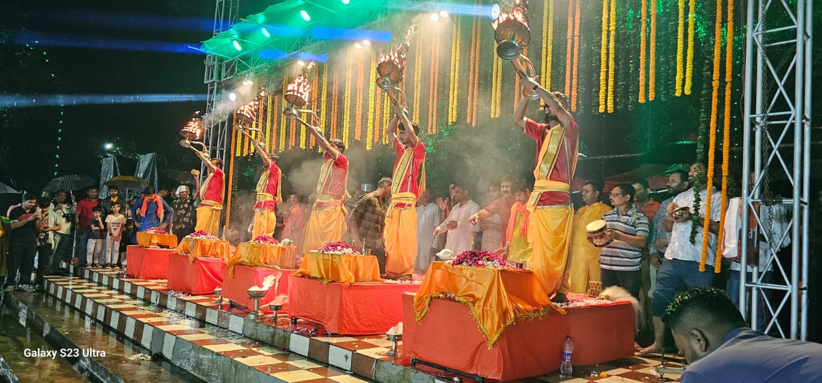 गर्जना और चमक के बीच जैसे ही आरती शुरू हुई, शंख, डमरू, घड़ीघंट और वैदिक मंत्रोच्चार से पूरा वातावरण गूंज उठा। बनारस से आए पंडितों के साथ जमशेदपुर के 15 सदस्यीय पंडित मंडली ने वैदिक विधि-विधान से आरती संपन्न कराई। छठ घाट के छलछलाते जल के बीच जब महाशिवालय में दीप प्रज्ज्वलित हुआ