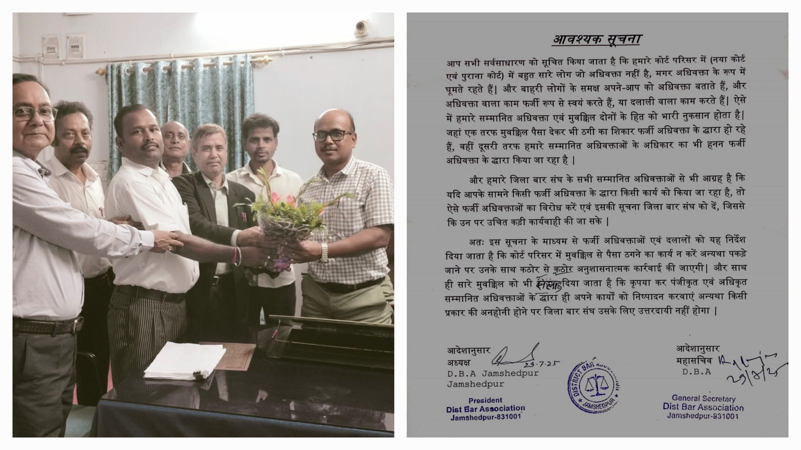 Jamshedpur: जमशेदपुर जिला बार एसोसिएशन ने कोर्ट परिसर में फर्जी अधिवक्ताओं की बढ़ती गतिविधियों पर गंभीर चिंता व्यक्त करते हुए आज एक अहम नोटिस जारी किया। एसोसिएशन के अध्यक्ष रतिंद्रनाथ दस और महासचिव राजेश रंजन के आदेशानुसार यह नोटिस जारी किया गया है, जिसमें कहा गया है कि नए व पुराने कोर्ट परिसर में कुछ लोग अवैध तरीके से अधिवक्ता बनकर आम जनता को ठग रहे हैं। यह न केवल नागरिकों को भ्रमित कर रहा है बल्कि अधिवक्ताओं की गरिमा और उनके अधिकारों का भी हनन है।