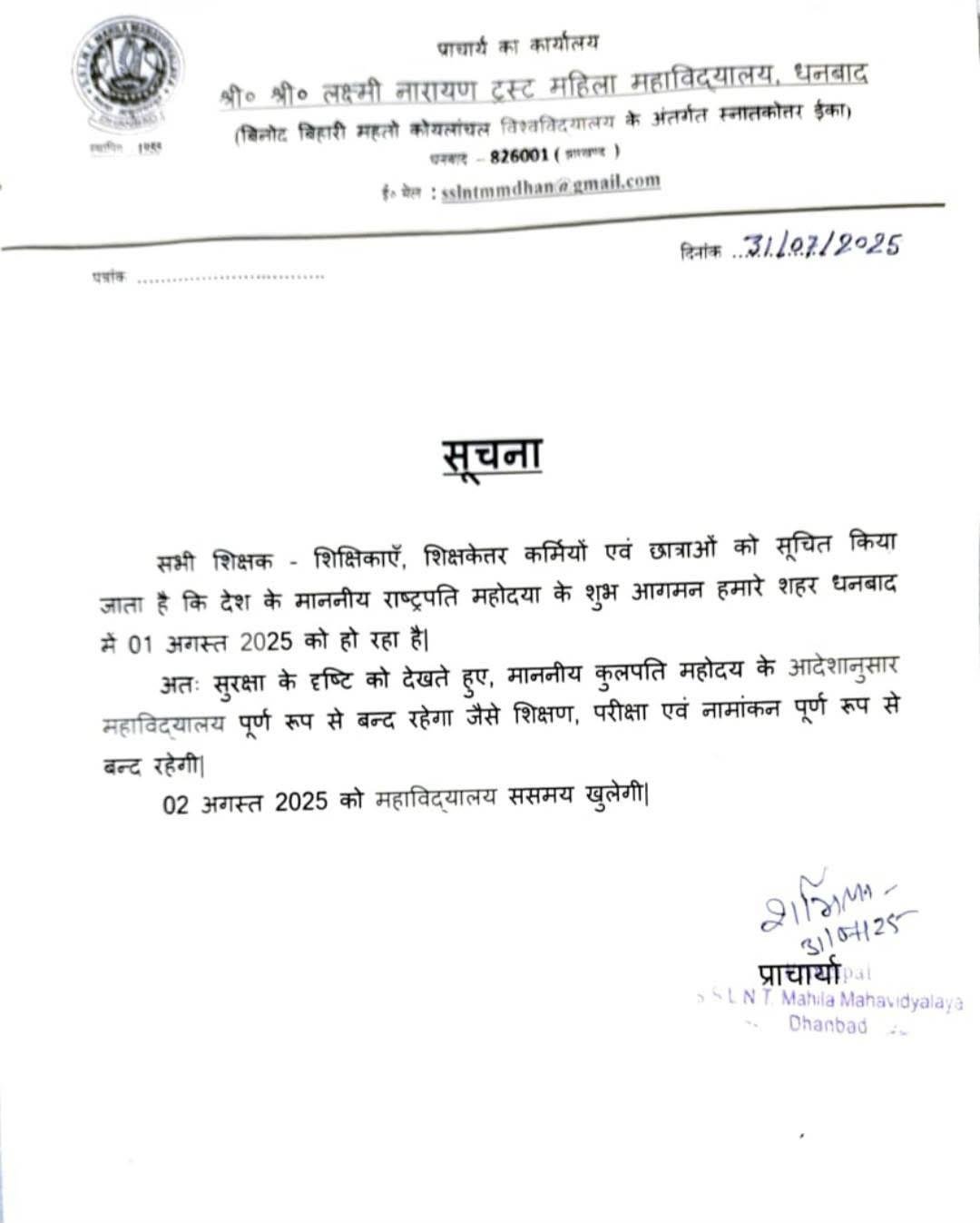 President Draupadi Murmu Visit Jharkhand: राष्ट्रपति आगमन को लेकर 1 अगस्त को SSLNT महिला कॉलेज रहेगा बंद