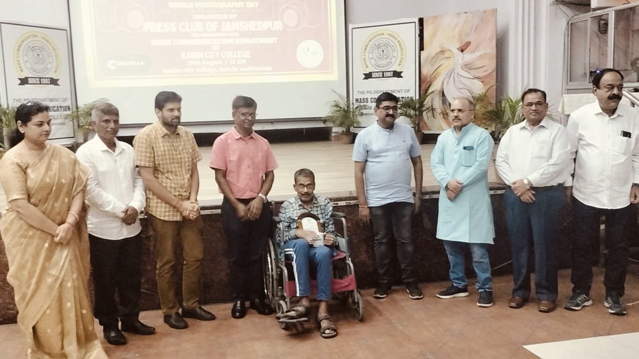 Press Club Of Jamshedpur, Karim City College: प्रेस क्लब ऑफ जमशेदपुर और करीम सिटी कॉलेज, मास कम्युनिकेशन विभाग के संयुक्त तत्वाधान में वर्ल्ड फोटोग्राफी डे के अवसर पर सम्मान सह पुरस्कार वितरण समारोह का आयोजन किया गया, इस समारोह में शहर के पुराने और प्रेस छायाकार के तौर पर लंबी यात्रा और अपनी जान को मुश्किल में डाल कर फोटोग्राफी करने वाले बी श्रीनिवास को लाइफ टाइम अचीवमेंट अवार्ड देकर सम्मनित किया गया।