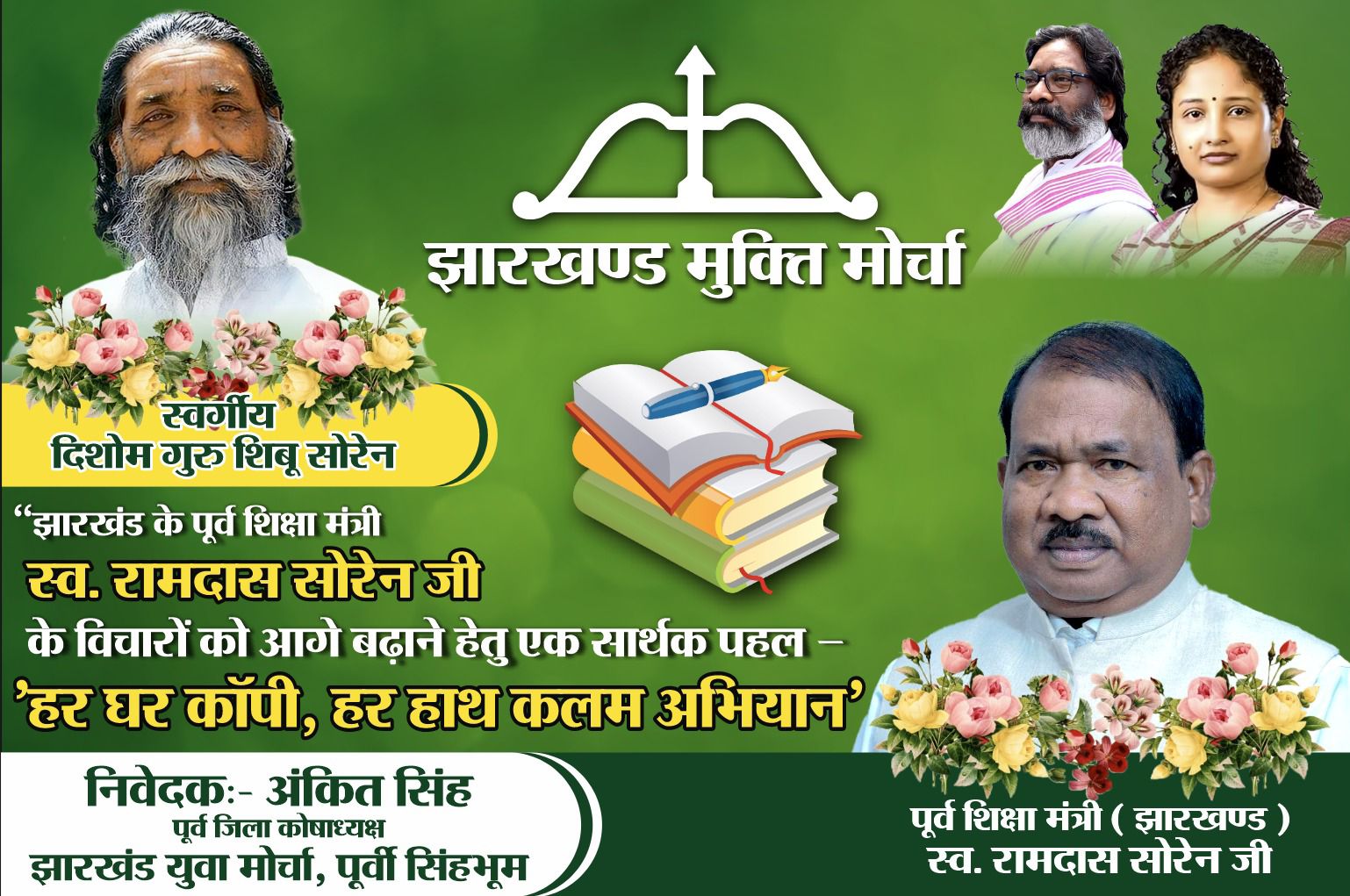 झारखंड के पूर्व शिक्षा मंत्री स्व. रामदास सोरेन की स्मृति में एवं उनके विचारों को आगे बढ़ाने के उद्देश्य से रविवार को बिरसानगर, जोन न॰ 8, स्थित सामुदायिक भवन में “हर घर कॉपी, हर हाथ कलम” अभियान का सफल आयोजन किया गया।
