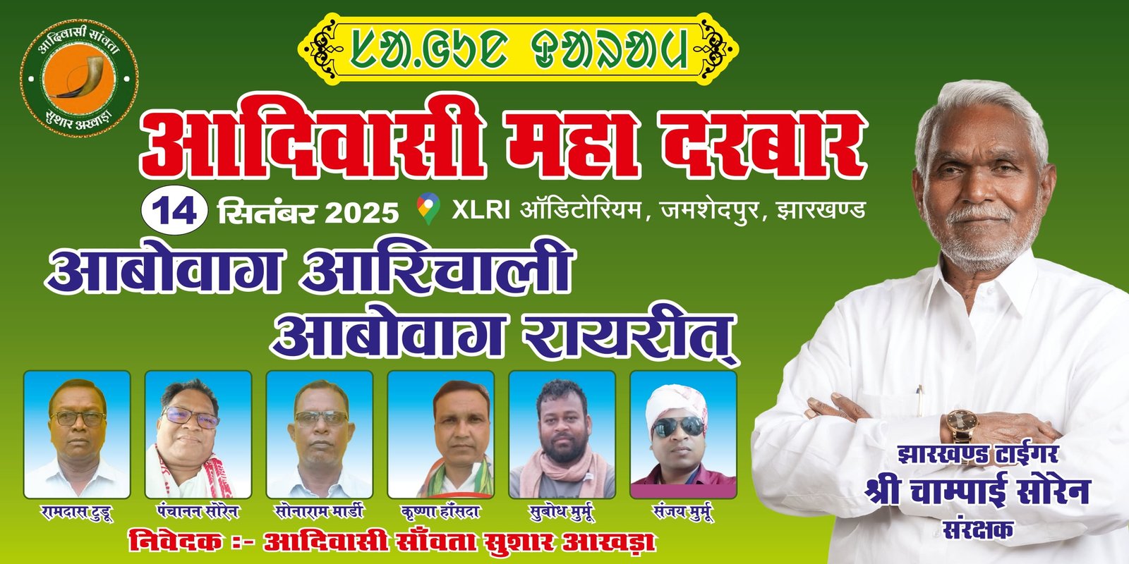 जमशेदपुर: झारखंड के पूर्व मुख्यमंत्री चंपाई सोरेन की अगुवाई में आगामी 14 सितंबर को जमशेदपुर के एक्सएलआरआई ऑडिटोरियम में "आदिवासी महा दरबार" का आयोजन किया जायेगा।