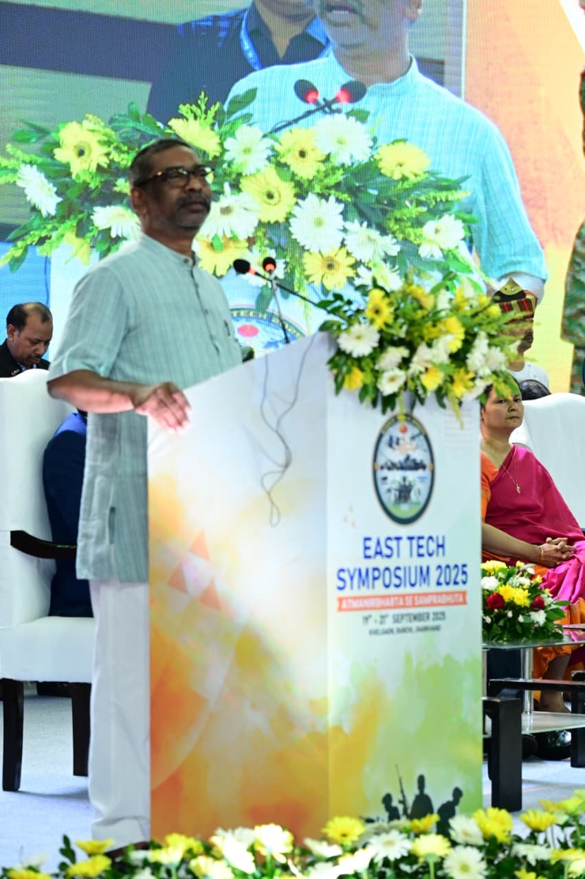 Ranchi: रांची में खेलगांव स्थित टाना भगत इंडोर स्टेडियम में आयोजित East Tech Symposium - 2025 (Defence Expo) के उद्घाटन समारोह में राज्यपाल संतोष गंगवार, मुख्यमंत्री हेमंत सोरेन और केंद्रीय रक्षा राज्य मंत्री संजय सेठ शामिल हुए।