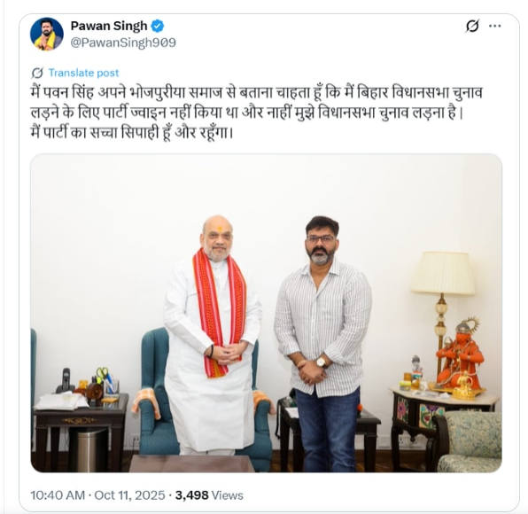 “मैं पवन सिंह अपने भोजपुरीया समाज से बताना चाहता हूं कि मैं बिहार विधानसभा चुनाव लड़ने के लिए पार्टी ज्वाइन नहीं किया था और ना ही मुझे विधानसभा चुनाव लड़ना है। मैं पार्टी का सच्चा सिपाही हूं और रहूंगा।”