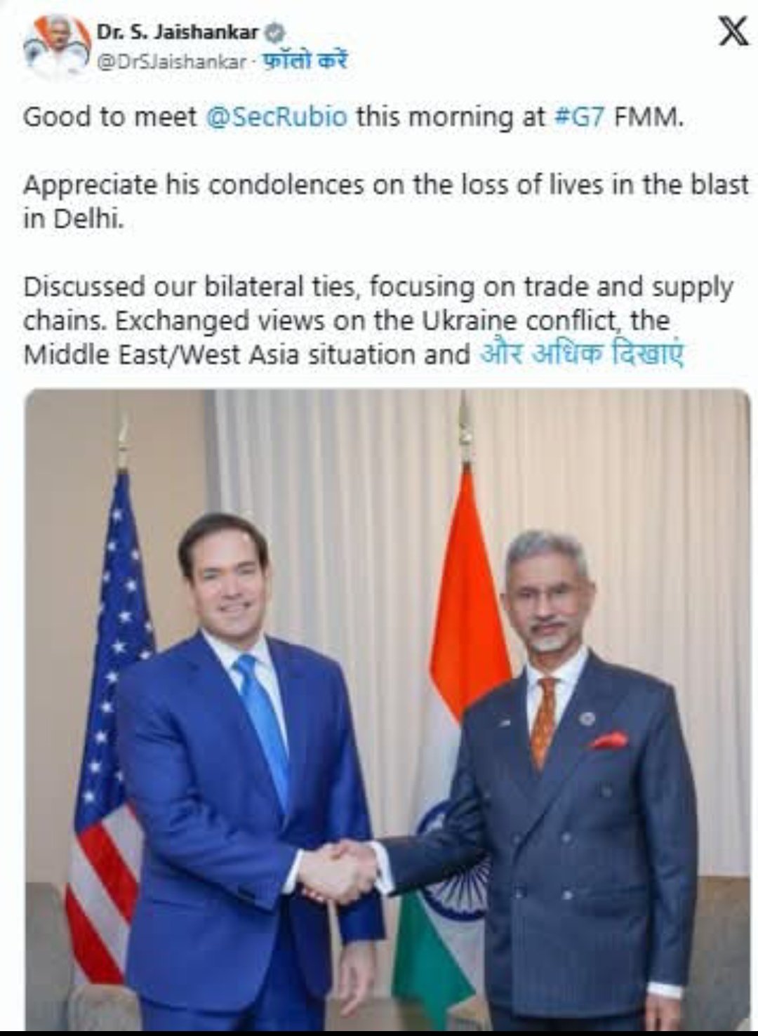 यह बयान कनाडा के नियाग्रा में हुई G7 विदेश मंत्रियों की बैठक के दौरान आया, जहां दोनों देशों ने आतंकवाद और सुरक्षा सहयोग को मजबूत करने पर चर्चा की। विदेश मंत्री एस. जयशंकर ने रूबियो से हुई मुलाकात के बाद एक्स (पूर्व ट्विटर) पर लिखा, “दिल्ली धमाके में जान गंवाने वालों के लिए अमेरिकी विदेश मंत्री द्वारा व्यक्त संवेदना की मैं सराहना करता हूं।”