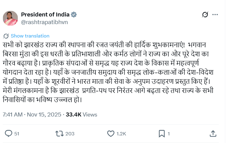 राष्ट्रपति द्रौपदी मुर्मू ने एक्स पर अपने संदेश में कहा कि भगवान बिरसा मुंडा की इस धरती ने देश को हमेशा गौरवान्वित किया है. उन्होंने लिखा कि प्राकृतिक संपदाओं और समृद्ध लोक कलाओं से भरपूर यह प्रदेश लगातार देश के विकास में महत्वपूर्ण योगदान देता रहा है. राष्ट्रपति ने राज्य की प्रगति और सभी नागरिकों के उज्वल भविष्य की कामना की.