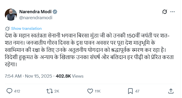 प्रधानमंत्री नरेंद्र मोदी ने झारखंड स्थापना दिवस और जनजातीय गौरव दिवस पर शुभकामनाएं दीं. उन्होंने कहा कि भगवान बिरसा मुंडा की धरती साहस और संघर्ष की गाथाओं से भरी हुई है. उन्होंने बिरसा मुंडा की 150वीं जयंती पर उन्हें नमन करते हुए कहा कि स्वतंत्रता संग्राम में उनका योगदान देश को सदैव प्रेरित करता रहेगा.