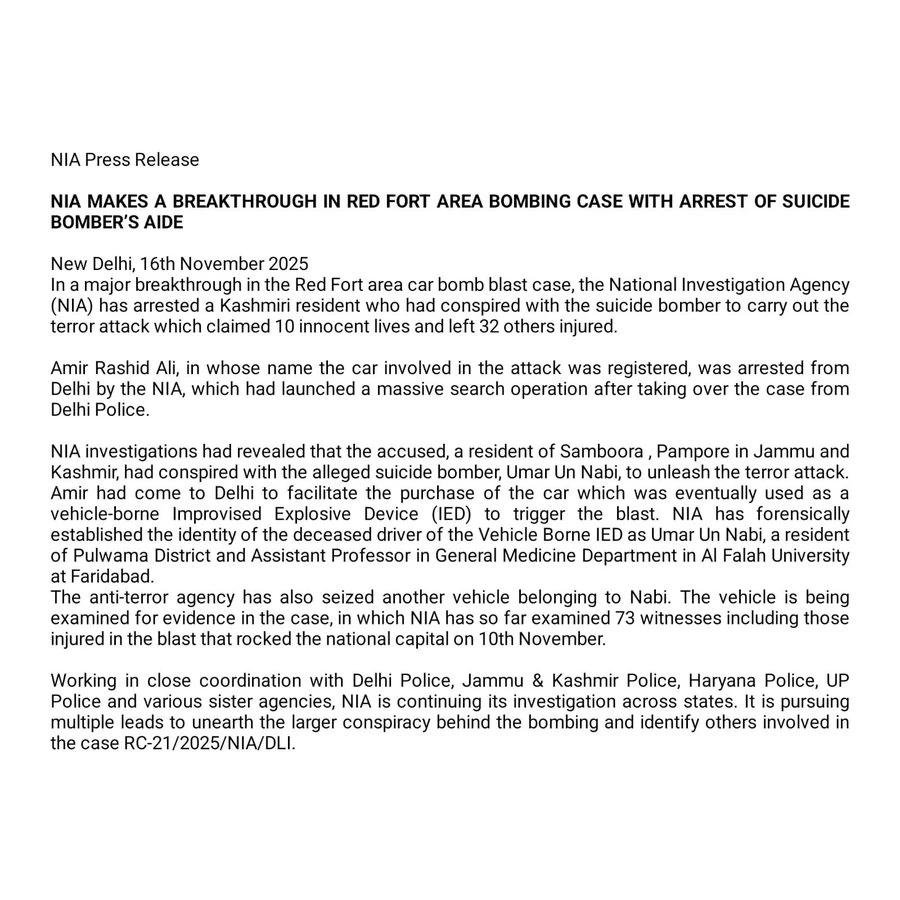 एनआईए इस मामले की जांच दिल्ली पुलिस, जम्मू-कश्मीर पुलिस, हरियाणा पुलिस, यूपी पुलिस और अन्य एजेंसियों के साथ मिलकर कर रही है. जांच एजेंसी अब यह पता लगाने की कोशिश में है कि इस धमाके के पीछे कौन-कौन लोग और संगठन जुड़े हुए थे और उनकी साजिश कितनी बड़ी थी. यह केस नंबर RC-21/2025/NIA/DLI के तहत दर्ज है और जांच अब राज्य से राज्य तक फैल चुकी है.