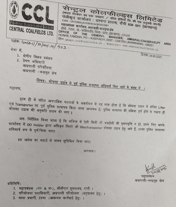 सूत्रों के अनुसार सीसीएल के आम्रपाली-चंद्रगुप्त क्षेत्र के महाप्रबंधक ने 24 अगस्त 2025 को एक पत्र जारी किया था. यह पत्र क्षेत्रीय विक्रय प्रबंधक और प्रेषण अधिकारी को संबोधित था तथा इसकी प्रति सीसीएल मुख्यालय, आम्रपाली परियोजना पदाधिकारी और टंडवा थाना पुलिस को भेजी गई थी. पत्र में लिखा गया था कि हाल की आपराधिक घटनाओं को देखते हुए डीओ होल्डर के लिफ्टर और ट्रांसपोर्टर का पुलिस सत्यापन आवश्यक है. सत्यापन के बाद ही कोयला उठाव की अनुमति दी जाएगी.