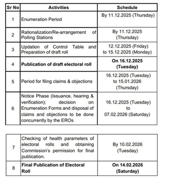 एन्यूमरेशन यानी घर-घर सत्यापन की अंतिम तिथि अब 11 दिसंबर रहेगी. मतदान केंद्रों के पुनर्गठन और पुनर्व्यवस्था का काम भी इसी तिथि तक पूरा किया जाएगा. इसके बाद कंट्रोल टेबल अपडेट करने और ड्राफ्ट रोल तैयार करने का चरण 12 दिसंबर से 15 दिसंबर तक चलेगा. ड्राफ्ट मतदाता सूची 16 दिसंबर को प्रकाशित की जाएगी. दावे और आपत्तियां दर्ज कराने का समय 16 दिसंबर से 15 जनवरी तक रखा गया है. नोटिस फेज और सुनवाई की प्रक्रिया 16 दिसंबर से 7 फरवरी तक चलेगी.