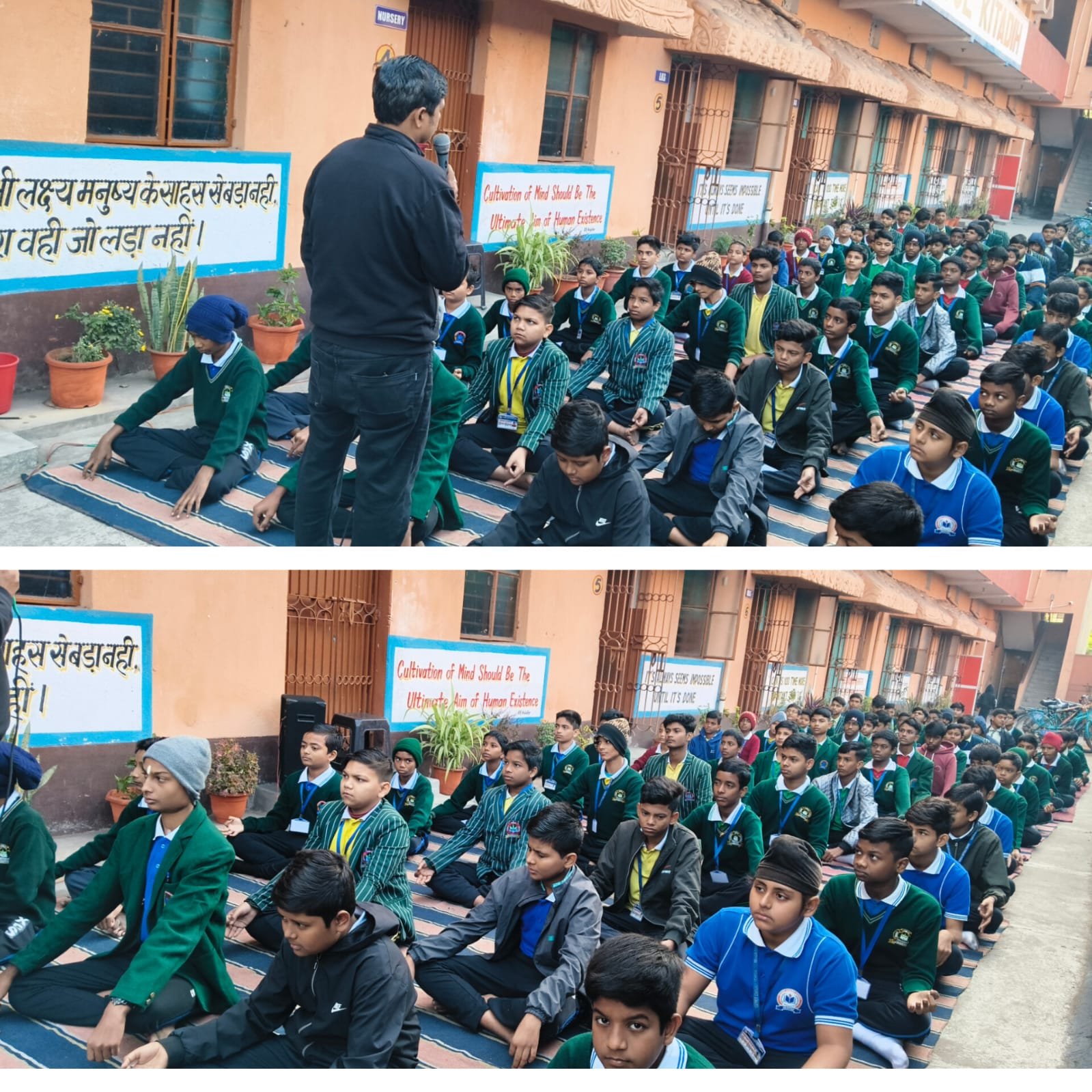 एक अनुभवी प्रशिक्षक ने माइक्रोफोन के माध्यम से विद्यार्थियों को सही ध्यान पद्धति का अभ्यास कराया। उन्होंने बताया कि प्रतिदिन 5 से 10 मिनट का ध्यान मन को शांत करने, तनाव कम करने और पढ़ाई में एकाग्रता बढ़ाने में अत्यंत लाभकारी है।