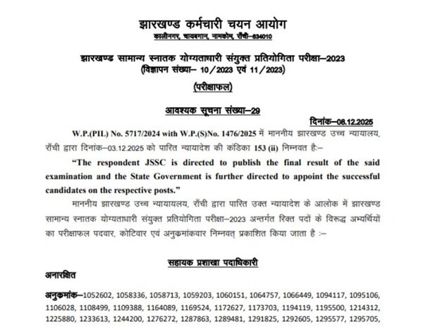 BREAKING: JSSC CGL परीक्षा का रिजल्ट जारी, पूरी रिजल्ट देखें यहां...