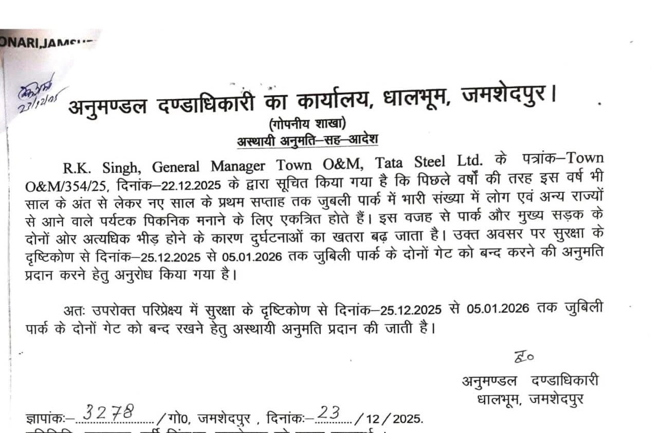 Janshedpur : नए साल और पिकनिक सीजन की बढ़ती भीड़ को देखते हुए जुबली पार्क के दोनों मुख्य गेट 12 दिनों के लिए बंद रहेंगे। टाटा स्टील प्रबंधन के अनुरोध पर जिला प्रशासन ने यह फैसला लिया है। इस संबंध में धालभूम के अनुमंडल पदाधिकारी चंद्रजीत सिंह ने आदेश जारी करते हुए जुबली पार्क के दोनों गेट को 25 दिसंबर से 5 जनवरी तक बंद रखने का निर्देश दिया है। प्रशासन की ओर से बताया गया है कि हर वर्ष नए साल के मौके पर जुबली पार्क में पिकनिक मनाने वालों की भारी भीड़ उमड़ती है। बड़ी संख्या में लोग पार्क में घूमने और समय बिताने पहुंचते हैं, जिससे सुरक्षा और यातायात व्यवस्था को लेकर चुनौतियां बढ़ जाती हैं। इसी को ध्यान में रखते हुए यह एहतियाती कदम उठाया गया है। बताया जाता है कि जुबली पार्क के भीतर से होकर बिष्टूपुर, सोनारी और कदमा को जोड़ने वाली सड़क पर नए साल के दौरान वाहनों की आवाजाही से जाम और हादसों की आशंका बनी रहती है। ऐसे में पार्क के दोनों गेट बंद कर इस मार्ग को अस्थायी रूप से बंद रखने का निर्णय लिया गया है, ताकि पिकनिक मनाने आने वाले लोगों की सुरक्षा सुनिश्चित की जा सके और किसी अप्रिय घटना से बचा जा सके।