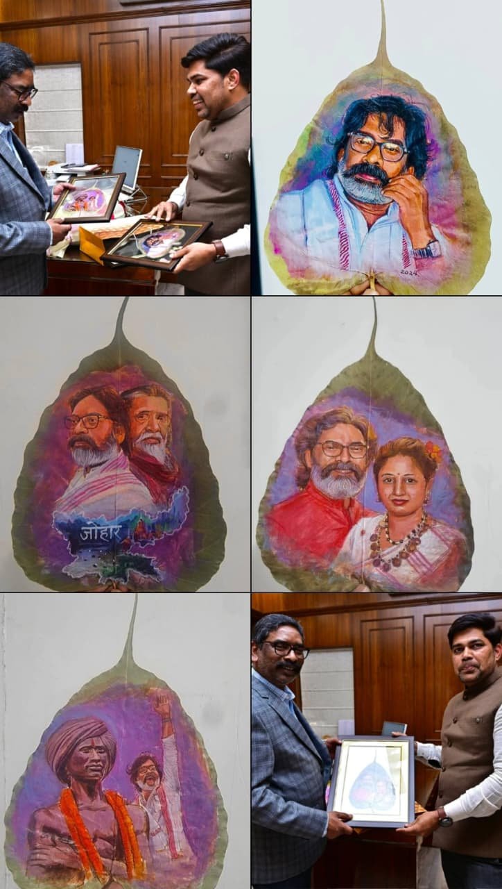 जिसमें खास बात यह रही कि एक पीपल के पत्ते पर झारखंड आंदोलन के प्रणेता उनके पिता पूर्व मुख्यमंत्री स्व शिबू सोरेन (दिशोम गुरु), एक में उनकी पत्नी गांडेय विधायक कल्पना सोरेन और महान आदिवासी नायक भगवान बिरसा मुंडा को एक साथ दर्शाती कलात्मक आकृति बनाई गई थी।