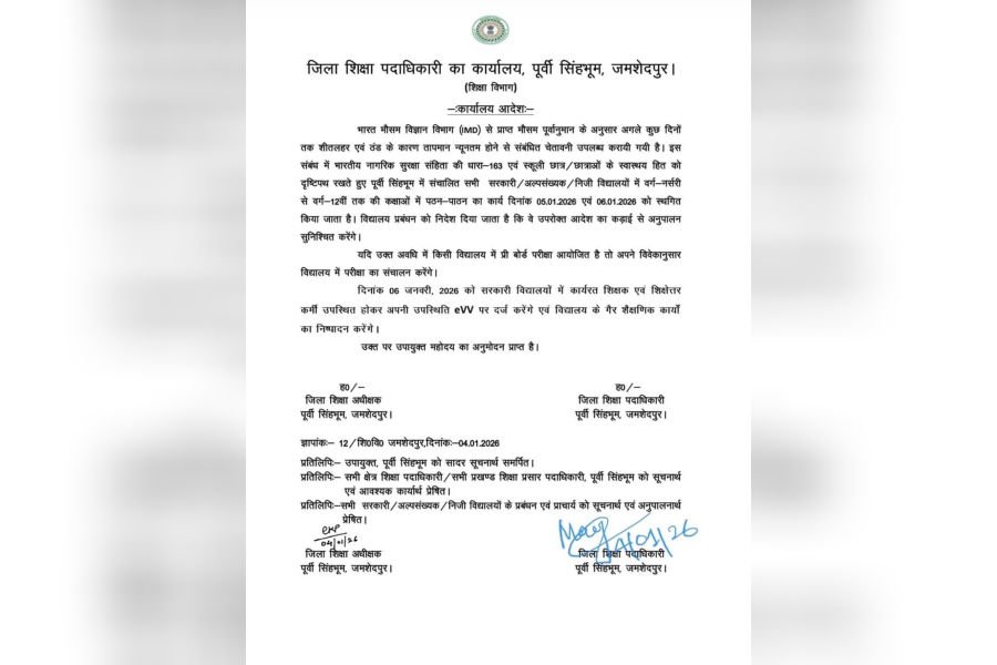 Jamshedpur News: जमशेदपुर में लगातार बढ़ती ठंड और शीतलहर को देखते हुए जिला शिक्षा विभाग ने अहम फैसला लिया है. भारत मौसम विज्ञान विभाग से प्राप्त मौसम पूर्वानुमान के आधार पर यह चेतावनी जारी की गई है कि आने वाले दिनों में न्यूनतम तापमान और गिर सकता है, जिससे बच्चों के स्वास्थ्य पर प्रतिकूल असर पड़ने की आशंका है. इसी को ध्यान में रखते हुए पूर्वी सिंहभूम जिले में संचालित सभी सरकारी, अल्पसंख्यक और निजी विद्यालयों में नर्सरी से लेकर 12वीं कक्षा तक की पढ़ाई दो दिनों के लिए स्थगित कर दी गई है.