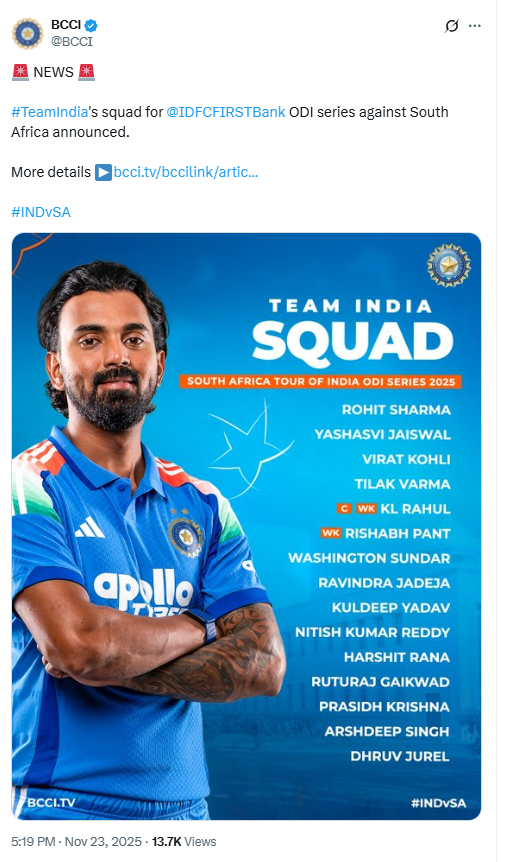 वनडे सीरीज के लिए घोषित भारतीय स्क्वॉड में केएल राहुल के साथ रोहित शर्मा, यशस्वी जायसवाल, विराट कोहली और तिलक वर्मा शामिल किए गए हैं. विकेटकीपिंग की जिम्मेदारी ऋषभ पंत और ध्रुव जुरेल को दी गई है. ऑलराउंड विभाग में वॉशिंगटन सुंदर, रवींद्र जडेजा और नीतीश कुमार रेड्डी को जगह मिली है.